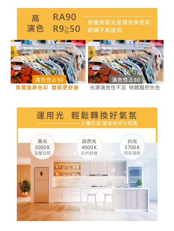 💡 超高演色性 Ra ≧90,R9 >50.還原真實色彩